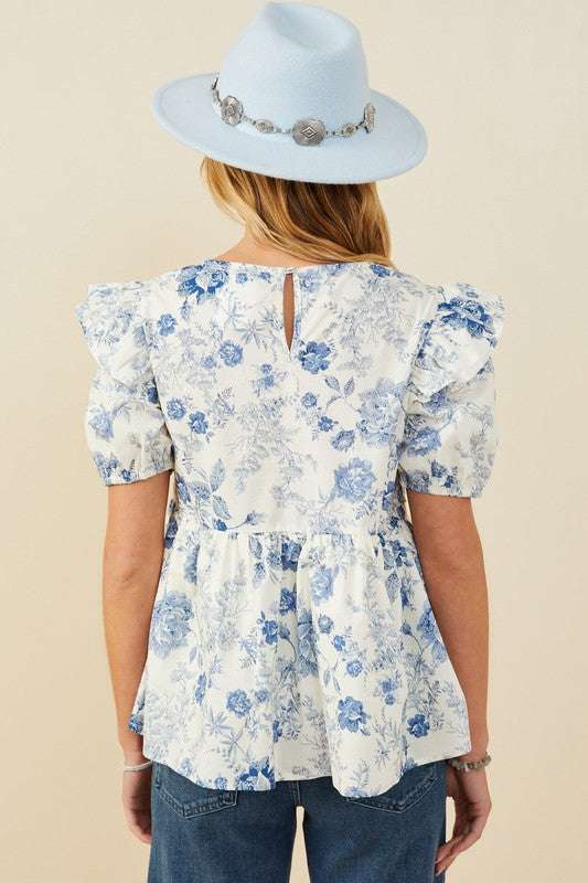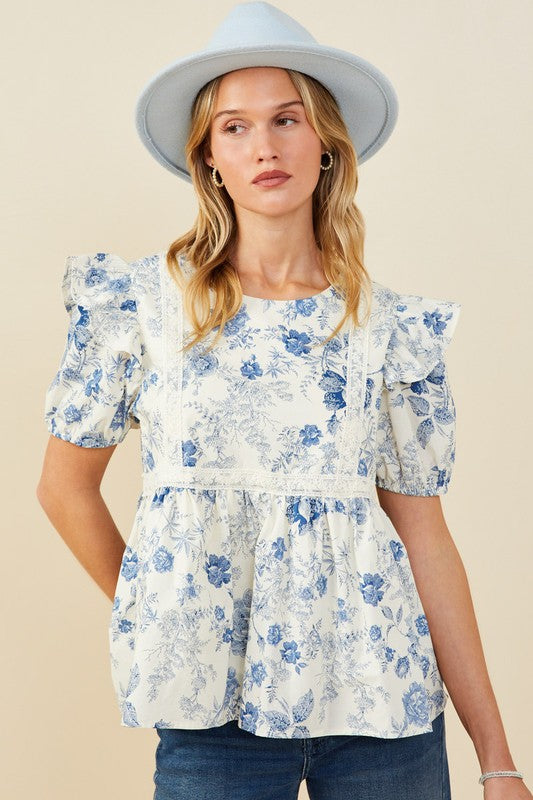 Blue Antique Floral Lace Trimmed Ruffle Top