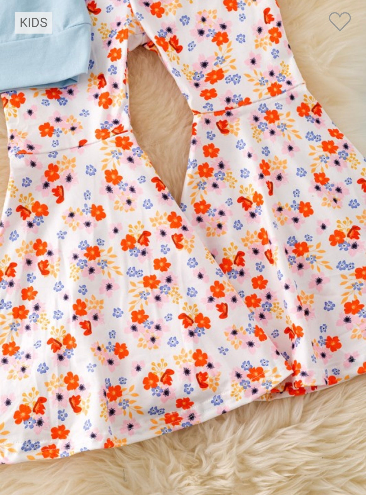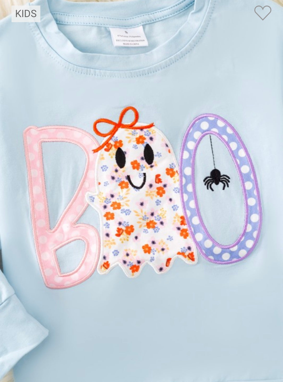 -Light blue sweatshirt adorned with a playful "Boo" applique-Perfectly paired with floral bell-bottom pants-TOP: 97% COTTON 3% SPANDEX-BOTTOMS: 95% POLYESTER 5% SPANDEX