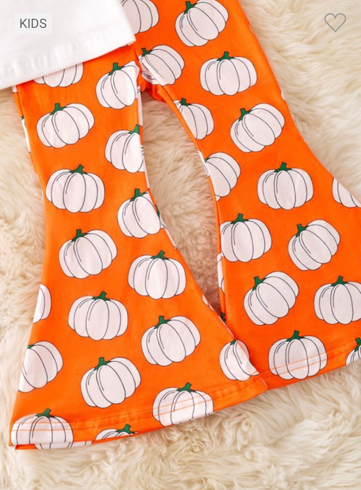 -Crisp white top adorned with a playful pumpkin applique-Paired with coordinating bell bottoms printed with festive pumpkins