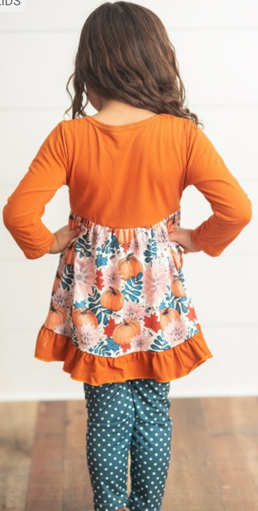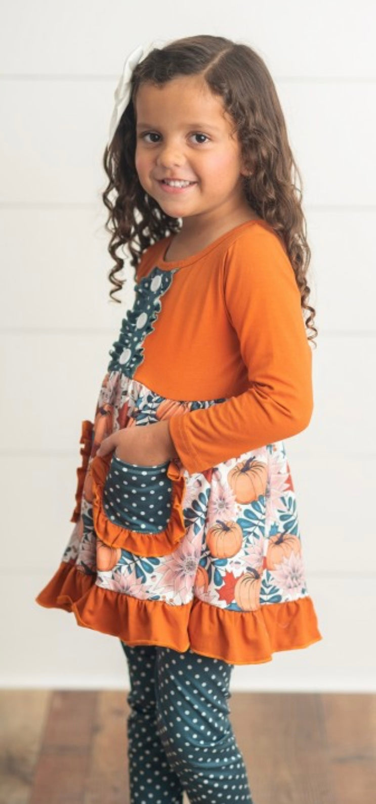 The cutest set for Fall Harvest season! Celebrate fall festivals and pumpkin patches in this sage and orange floral & pumpkin print tunic top with ruffles pockets and button details. Polka dot leggings included. 90% Polyester, 10% Spandex